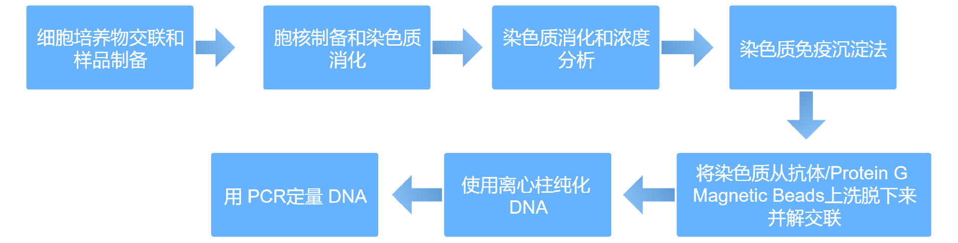 CHIP实验在活细胞状态下固定蛋白质-DNA复合物,并将其随机切断为一定长度范围内的染色质小片段,然后通过免疫学方法沉淀此复合体,特异性地富集目的蛋白结合的DNA片段,通过对目的片断的纯化与检测,从而获得蛋白质与DNA相互作用的信息。