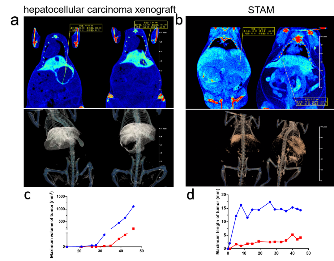 Micro-CT检测肝肿瘤。(a)肝原位异种移植模型肿瘤示意图,黄色线段及方框内标注信息为实体瘤测量线段及长度,下方为3D渲染图像可在相同位置看到非肝细胞的肿瘤实质区域。(b)STAM模型肿瘤示意图黄色线段及方框内标注信息为实体瘤测量线段及长度,下方为3D渲染图像可在相同位置看到非肝细胞的肿瘤实质区域。(c,d) 肝原位肿瘤体积与STAM模型肿瘤最大长经统计图。