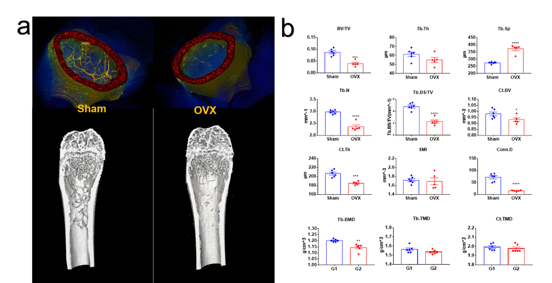 卵巢切除诱导的骨质疏松模型离体检测。(a)骨质疏松模型假手术组(sham)和手术组(OVX)3D重建图像。(b)骨小梁、皮质骨结构性参数以及密度属性参数统计图。指标意义参考下方表格,综上结果模型特征明显,手术成功。