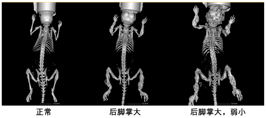 三维成像显示不正常表型小鼠长骨(四肢)可见多处骨裂和骨增厚以及弯曲。颅骨、髋骨、坐骨可见明显异常。